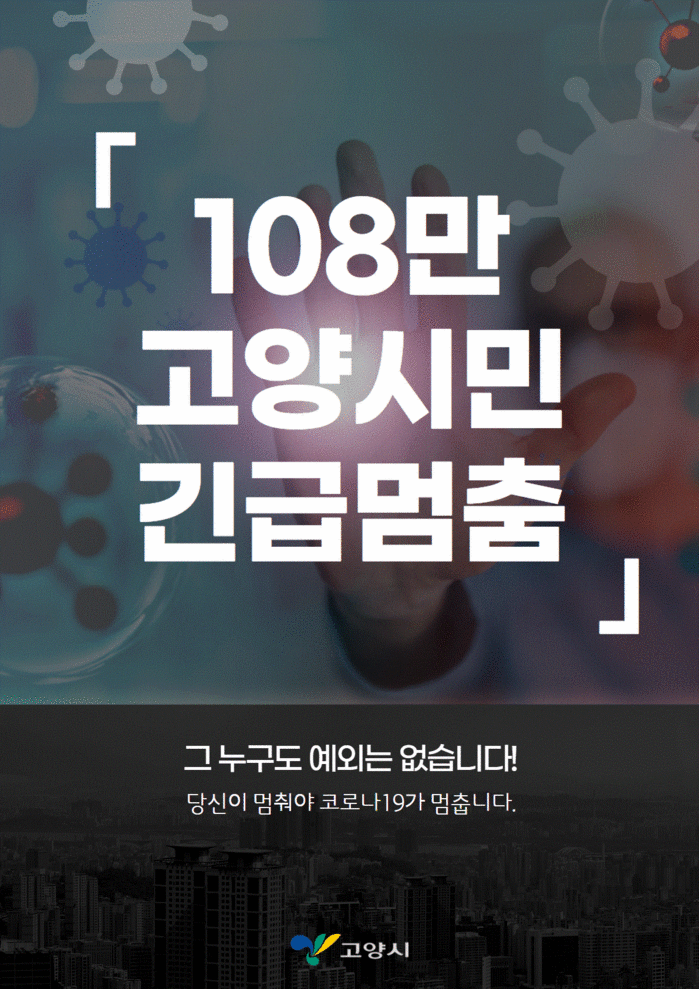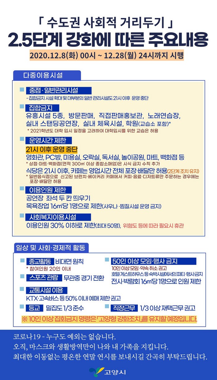 [부자동네타임즈 김인수기자] 고양시는 "12월 8일 0시부터 28일 24시까지 3주 동안 사회적 거리두기를 2.5단계로 격상함과 동시에 ‘108만 고양시민 긴급 멈춤’에 따른 강화된 고양형 거리두기를 추진한다."고 밝혔다.