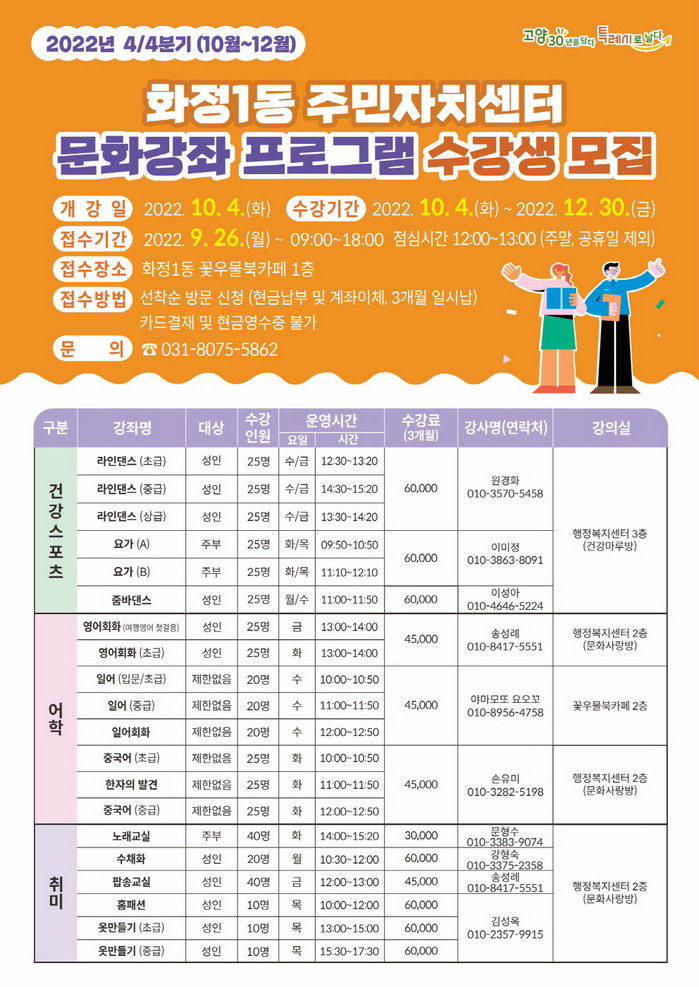 [부자동네타임즈 김인수기자] 고양특례시 화정1동 주민자치회는 오는 10월 4일부터 12월 30일까지 3개월 과정으로 주민자치센터 2022년 4분기 문화강좌를 운영한다.