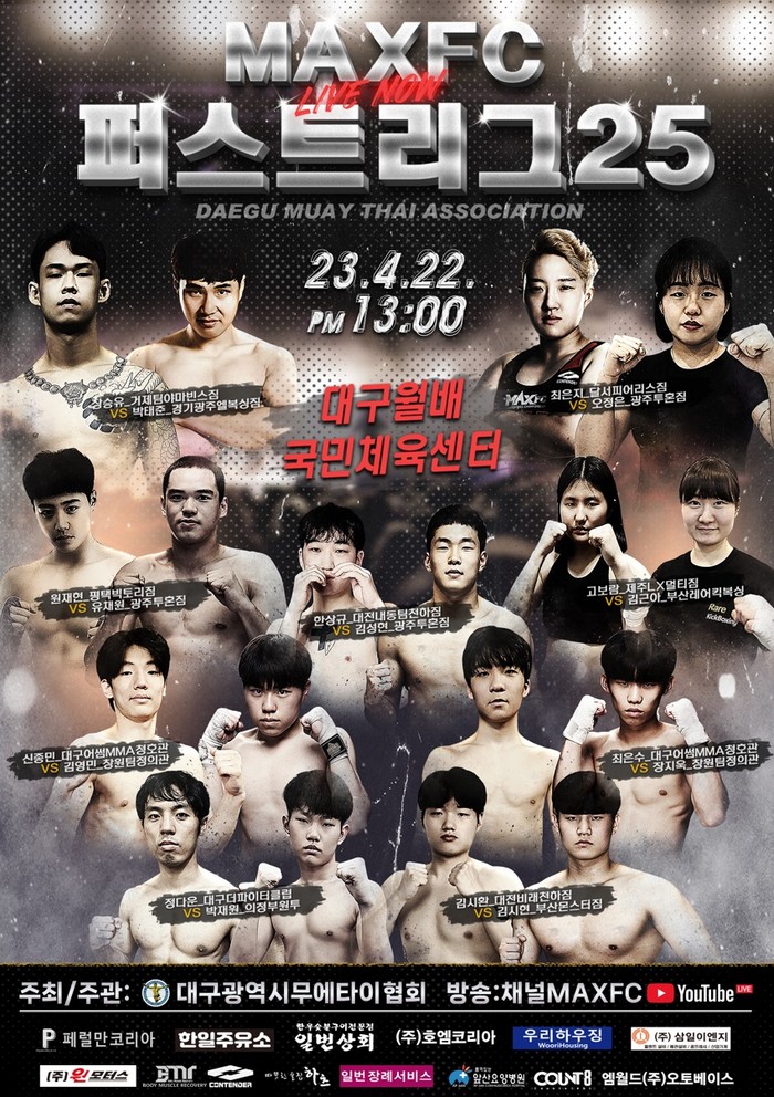 [부자동네타임즈 김인수기자] 국내 최대 입식격투기 단체 MAX FC가 오는 4월 22일(토) 대구월배국민체육센터에서 열리는 ‘제1회 달서구청장배 무에타이 선수권 대회 및 MAXFC 퍼스트리그 25’의 전 경기를 확정하고 대진 및 포스터를 발표했다. 대구광역시 달서구(구청장 이태훈) 지역 아마추어 선수 포함 총 27경기 54명이 출전을 확정 했다.