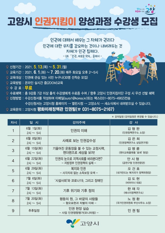 인권에 관심 있는 시민 누구나 무료로 수업에 참여할 수 있으며, 신청은 고양시청 홈페이지에서 신청서를 내려 받아 평화미래정책관 인권팀 이메일로 제출하면 된다.