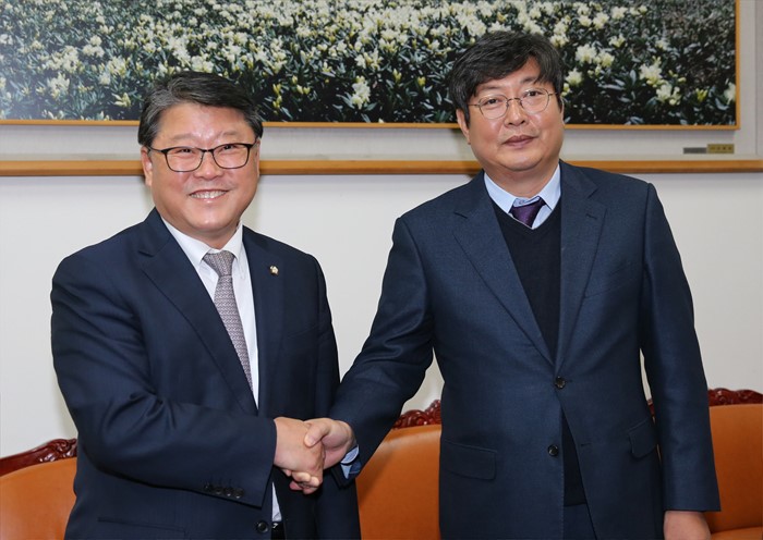 | △ 조원진(왼쪽), 이춘석 여야 원내수석부대표가 16일 오후 서울 여의도 국회에서 쟁점 현안 관련 논의를 위해 만나 악수하고 있다. <사진제공=포커스뉴스> |