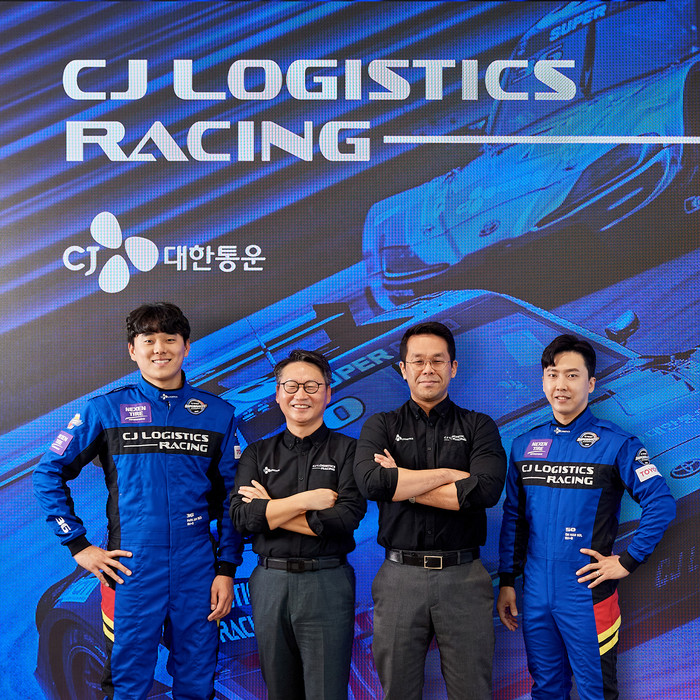 [사진 설명] 2023년 CJ로지스틱스 레이싱팀 드라이버 입단식에서 포즈를 취하고 있는 (왼쪽부터) 박준서 선수, 허신열 CJ로지스틱스 레이싱팀 단장 겸 CJ대한통운 커뮤니케이션 경영리더, 이정웅 감독, 오한솔 선수.