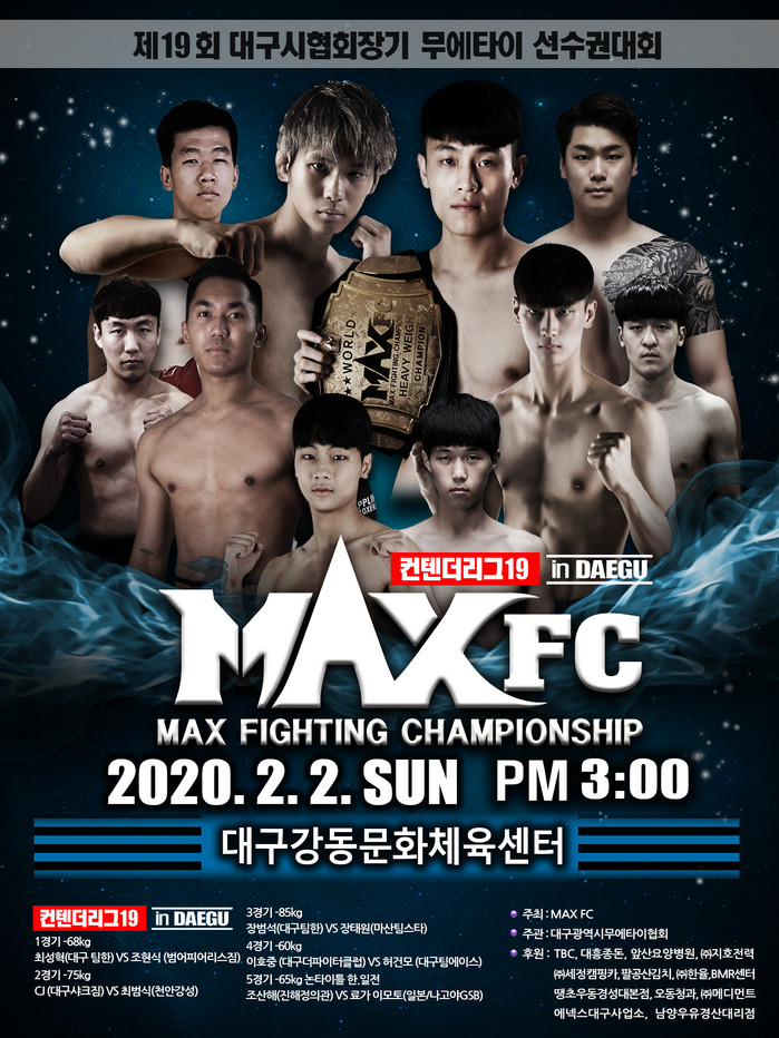 [부자동네타임즈 김인수기자] 2020년 MAX FC 첫 대회 일정은 대구에서 시작한다. 주최측에 따르면 2월 2일 대구 강동문화체육센터에서 '제18회 대구시협회장기 무에타이선수권대회 및 MAXFC 컨텐더리그 19 IN 대구'(이하 컨텐더리그 19)를 개최한다고 발표했다.