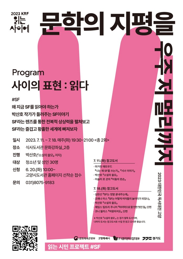 [부자동네타임즈 김인수기자] 2023 대한민국 독서대전을 기념해 오는 7월 11일부터 18일까지 식사도서관에서 읽는 시민 프로젝트인 문학의 지평을 우주 저 멀리까지를 운영한다.