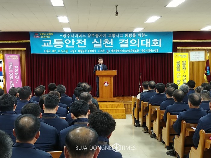 [광주=부자동네타임즈 손권일 기자]광주 시내버스 운전원 350여 명이 24일 북구 오룡동 소재 대창운수 대강당에서 ‘교통안전 실천 결의대회’를 열고 선진 교통문화 정착에 힘을 모으기로 했다.