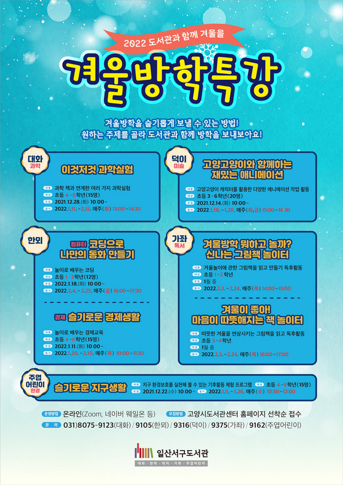 [부자동네타임즈 김인수기자] 고양시 일산서구의 5개 도서관(대화·한뫼·덕이·가좌·주엽어린이도서관)이 겨울방학을 맞이해 오는 1월 5일부터 겨울방학특강 프로그램을 운영한다.