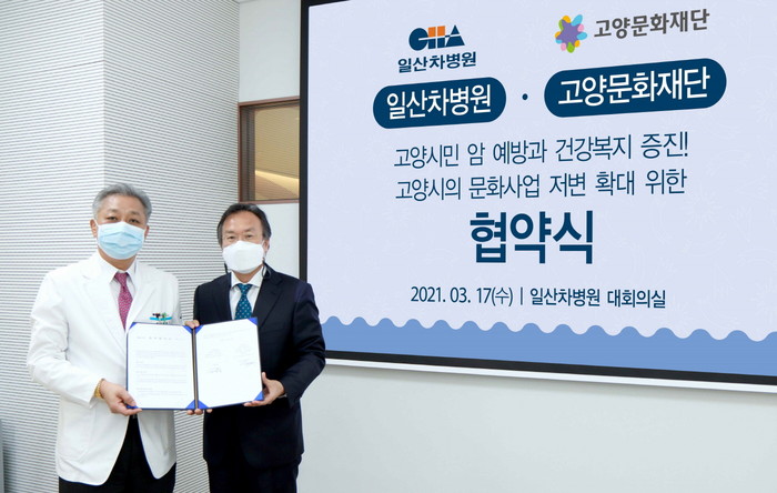 이날 협약식에는 고양문화재단 정재왈 대표이사와 일산 차병원 강중구 병원장 등 양 기관 관계자들이 참석했으며 암 예방 및 지역문화발전을 위해 다양한 프로그램을 발굴·지원하기로 했다. 또한 양 기관이 보유하고 있는 전문성과 콘텐츠 현황들을 공유하고 상호 협력하기로 했다.