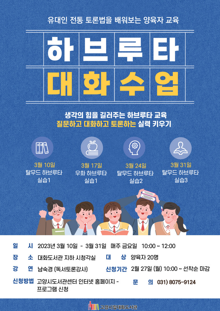 [부자동네타임즈 김인수기자] 고양특례시(시장 이동환) 대화도서관이 오는 3월 오전 10시부터 시청각실에서 부모교육 특강 하브루타 대화수업을 운영한다.
