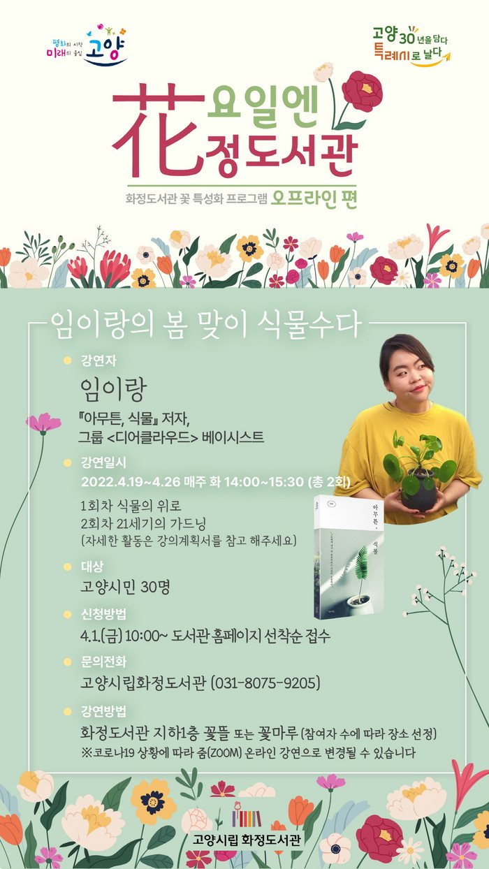 아무튼, 식물의 저자 임이랑 작가는 ‘임이랑의 봄맞이 식물수다’에서 식물이 주는 심리적 위로와 여러 가지 식물 키우기 팁 그리고 가드닝 시장의 트렌드와 장비에 대한 이야기를 들려준다. 오는 4월 19일, 26일 총 2회에 걸쳐 진행되는 강연은 4월 1일(금) 10시부터 고양시 도서관센터 홈페이지에서 신청할 수 있다.