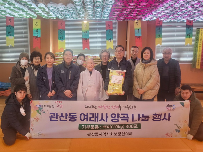 [부자동네타임즈 김인수기자] 고양특례시 관산동 행정복지센터(동장 김선정)는 지난 15일, 여래사에서 어려운 이웃을 위한 사랑의 양곡 나눔 행사를 시행했다고 밝혔다.