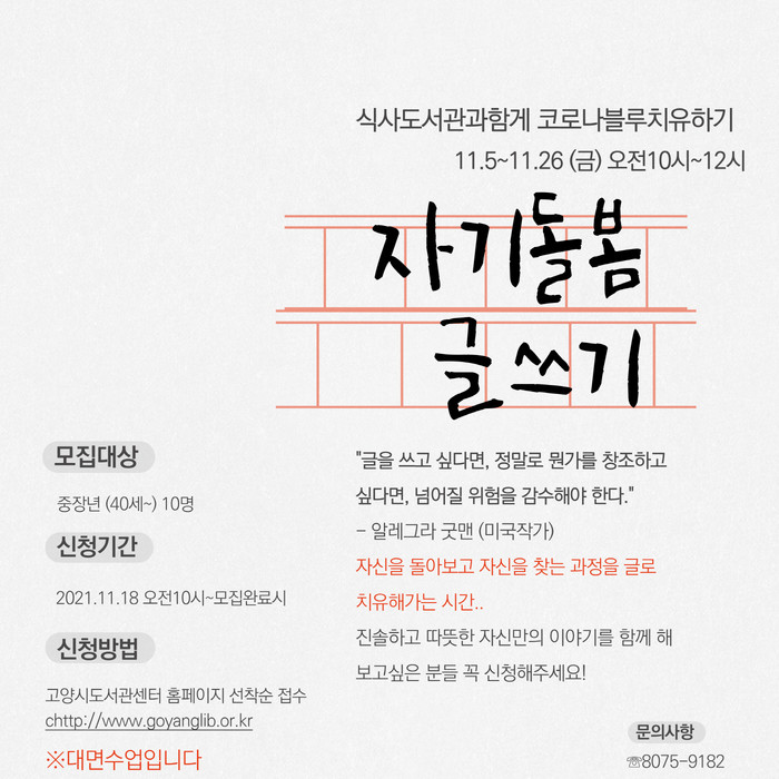 이 프로그램은 코로나 19시대에도 삶의 주인공으로 살아가기 위해 자신을 돌보고 소통하는 법을 배우는 글쓰기 강좌로, 11월 5일(금)부터 11월 26일(금)까지 매주 금요일 오전 10시부터 총4회에 걸쳐 대면 방식으로 운영된다.