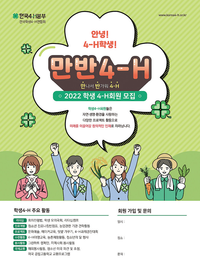 [부자동네타임즈 김인수기자] 한국4-H본부(회장 방덕우)는 신학기가 시작된 이달부터 신규 4-H회원 모집과 4-H회 조직 등록이 시작되는 등 올해 4-H활동이 본격적인 기지개를 펴고 있다.