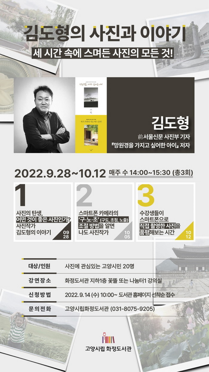 [부자동네타임즈 김인수기자] 고양특례시(시장 이동환) 화정도서관이 김도형 사진작가를 초청해 강연을 개최한다. 이번 강연은 ‘김도형의 사진과 이야기: 세 시간 속에 스며든 사진의 모든 것!’이라는 주제로 오는 9월 28일부터 10월 12일, 매주 수요일 14:00~15:30 총 3회에 걸쳐 진행된다.
