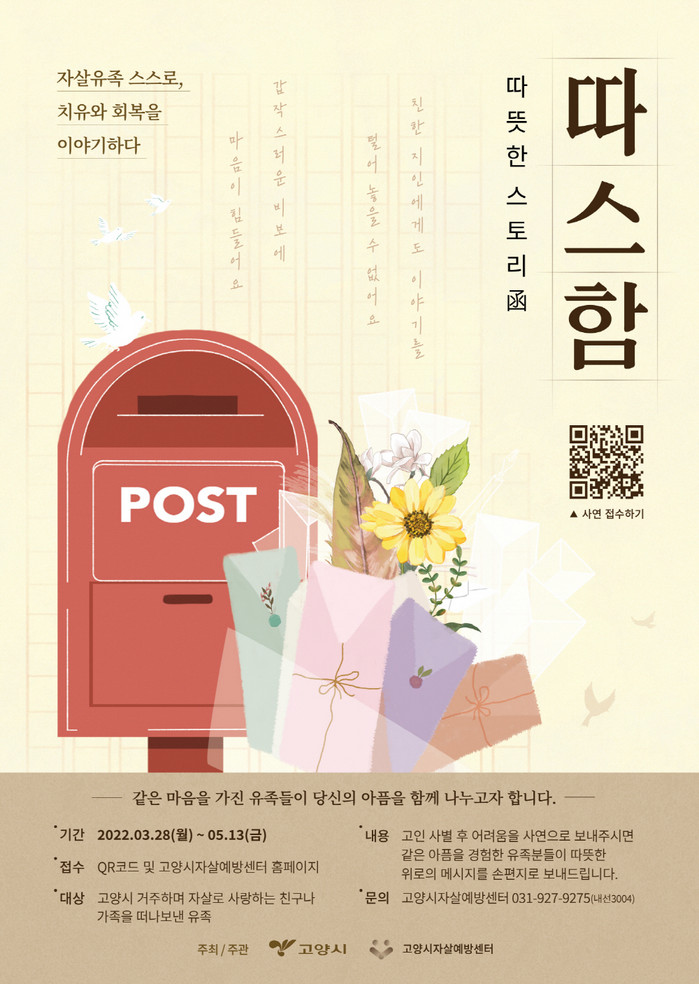 참여는 QR코드 및 고양시자살예방센터 홈페이지에 접속하면 할 수 있다. 사연은 3월 28일(월)부터 5월13일(금)까지 받는다.