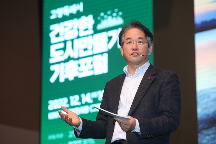 이동환 고양특례시장은 14일 진행된 기후포럼에서 고양특례시 정책설명에 나서 지방정부와 시민들의 참여를 강조하면서, 친환경 자족도시 조성에 대한 메시지를 전했다.
