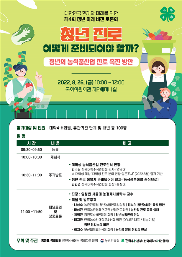 한국4-H본부(전국대학4-H연합회), 농촌진흥청 그리고 한국4-H본부 국회자문위원인 홍문표 국회의원이 주최·주관하는 이번 토론회는 ‘청년 진로 어떻게 준비되어야 할까(청년의 농식품산업 진로 촉진 방안)’를 주제로 진행된다.