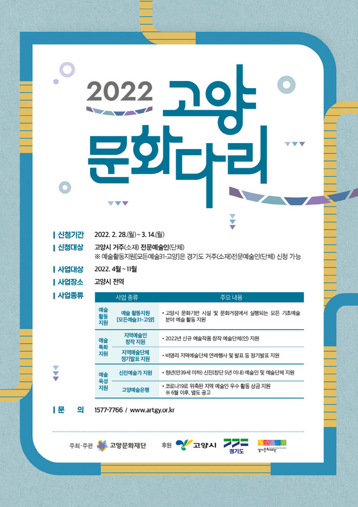 [부자동네타임즈 김인수기자] 고양문화재단(이사장 이재준)은 고양특례시 예술인 및 예술단체의 문화예술진흥 및 육성을 위해 새롭게 개편된 2022년 고양문화다리 사업의 공모를 시작한다. 올해는 ‘예술활동지원’, ‘예술특화지원’, ‘예술육성지원’의 세 가지 카테고리 아래 총 5개의 다양한 개별 공모지원사업이 동시에 진행이 되며, 신청 및 접수는 2월 28일부터 3월 14일까지다.