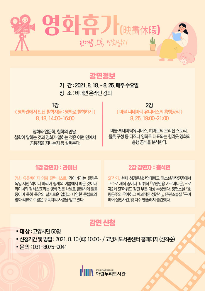 [부자동네타임즈 김인수기자] 고양시 아람누리도서관이 폭염에 지친 시민들을 위해 영화휴가(映畫休假) : 한여름 오후, 영화읽기 예술특화 프로그램을 진행한다.