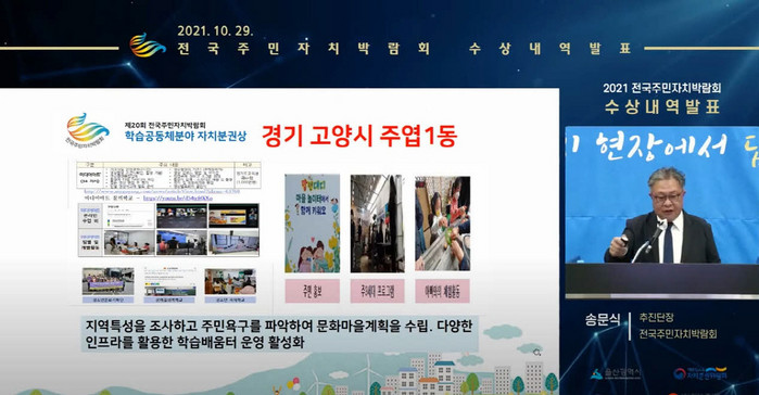 주엽1동의 지역특성을 조사하고 주민욕구를 파악해 문화마을 계획을 수립한 점, 다양한 인프라를 활용한 학습배움터 운영을 활성화한 점을 인정받았다.