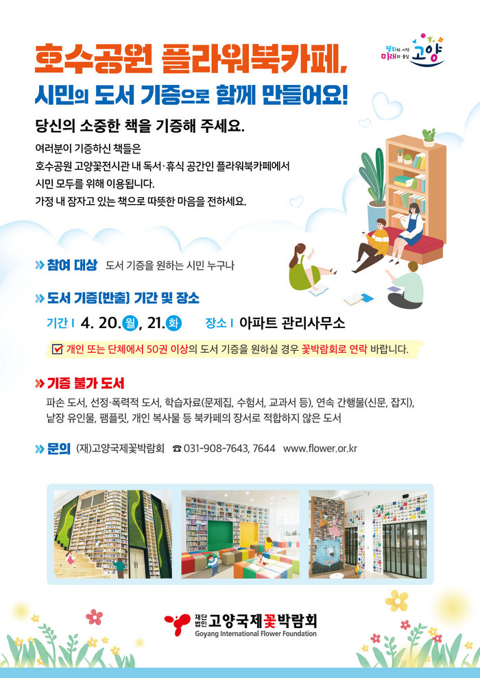 이번 캠페인은 호수공원 고양꽃전시관에 조성하고 있는 화훼복합문화공간 ‘플라워북카페’를 시민들과 함께 만들어가기 위해 기획되었으며, 캠페인을 통해 기증받은 책은 북카페 서가에 비치될 예정이다.