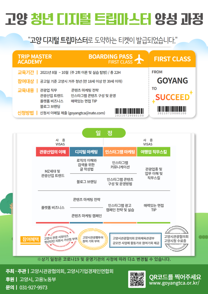 교육을 이수하게 되는 청년을 대상으로 관광서포터즈 또는 청년인턴 선발시 가점 부여, 고양시 팸투어 참가, DMO사업 및 고양시 관광행사 스탭지원 등의 기회가 제공될 예정이다.