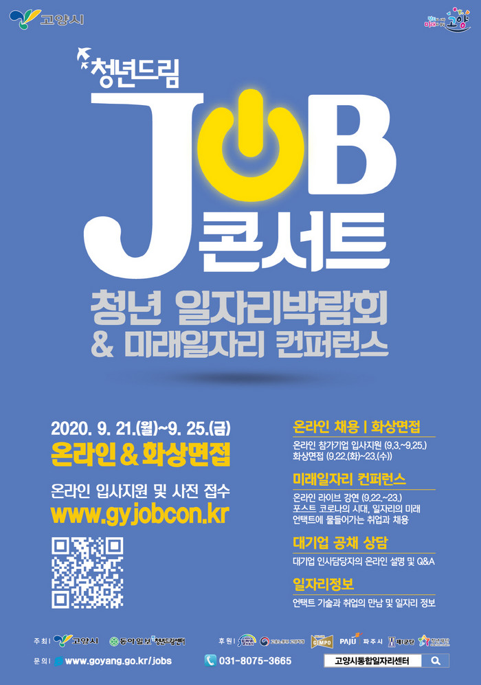 [부자동네타임즈 김인수기자] 고양시는 "오는 9월 21일(월)부터 25일(금)까지 청년일자리박람회와 미래일자리 컨퍼런스가 결합된 ‘청년드림 JOB콘서트’를 온라인으로 운영한다."고 밝혔다.