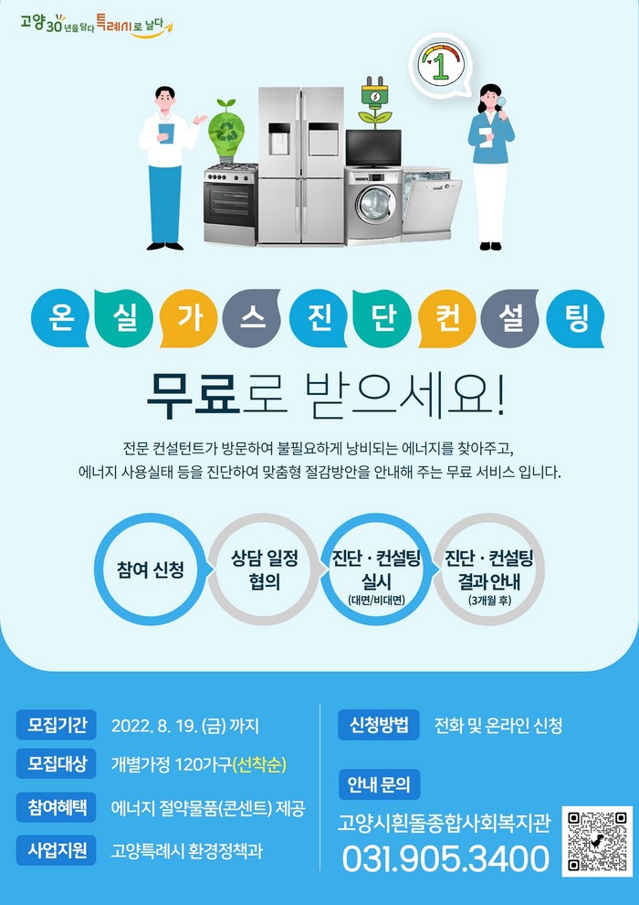 [부자동네타임즈 김인수기자] 고양특례시(시장 이동환)가 탄소중립 실현을 위한 일상 속 실천 방법 중 하나인 온실가스 진단 컨설팅 참여자 120가구를 8월 3일부터 19일까지 선착순으로 모집한다.