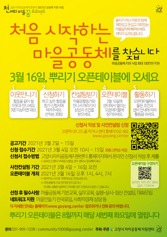 ‘뿌리기’ 지원을 희망하는 공동체는 고양시자치공동체지원센터 홈페이지에서 관련 내용을 확인할 수 있다. 자세한 문의는 고양시 자치공동체지원센터로 하면 된다.