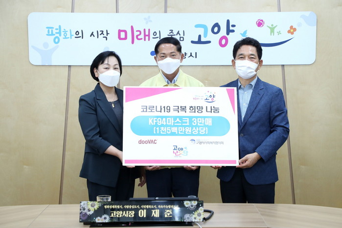 [부자동네타임즈 김인수기자] 고양시는 지난 3일 ㈜두백에서 코로나19 극복 희망 나눔을 위해 KF94마스크 3만매를 기부해 전달식을 진행했다.