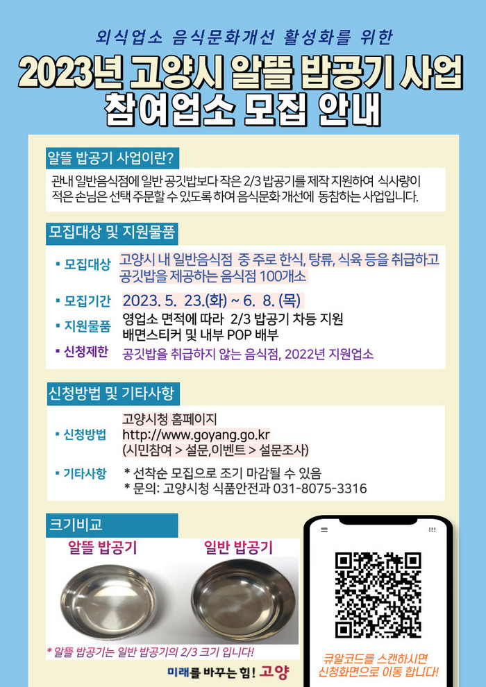 신청 대상은 고양시에서 일반음식점을 운영하고 주로 한식, 탕류, 식육 등의 메뉴를 취급하며 공깃밥을 제공하는 영업형태로 해당 사업을 적극적으로 실천할 의지가 있는 업소이며, 공깃밥을 취급하지 않는 음식점, 2022년도 지원업소 등은 제외된다.
