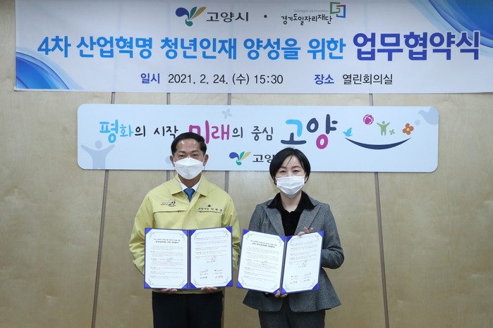 [부자동네타임즈 김인수기자] 고양시와 경기도일자리재단(대표이사 제윤경)이 지난 24일 시청 열린회의실에서 4차 산업혁명 청년인재 양성을 위한 업무협약을 체결했다.