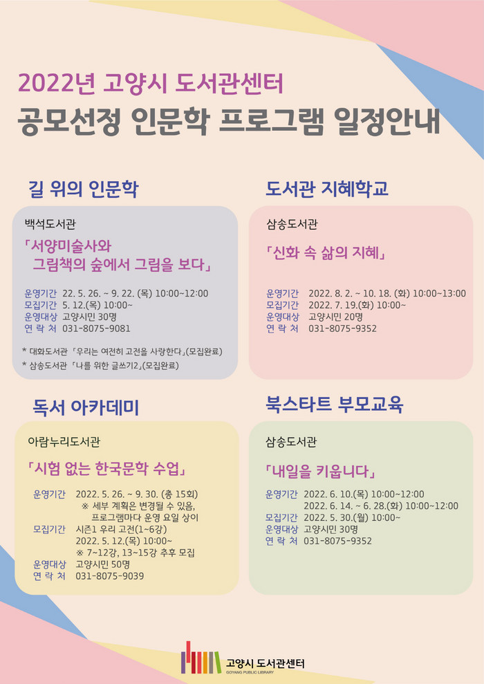 모집공고 및 프로그램 참여 신청 등 더욱 자세한 사항은 고양시 도서관센터 홈페이지에서 확인하면 된다.