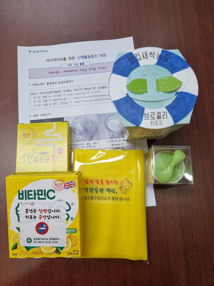 키트 구성품은 라텍스 밴드, 안마볼, 새싹재배키트, 유산균, 비타민 등이다. 자가격리자는 키트에 동봉된 안내문을 읽고 라텍스밴드와 한국건강증진개발원에서 개발한 실내운동 3종 영상을 활용해 격리 중에도 신체 활동을 할 수 있다.