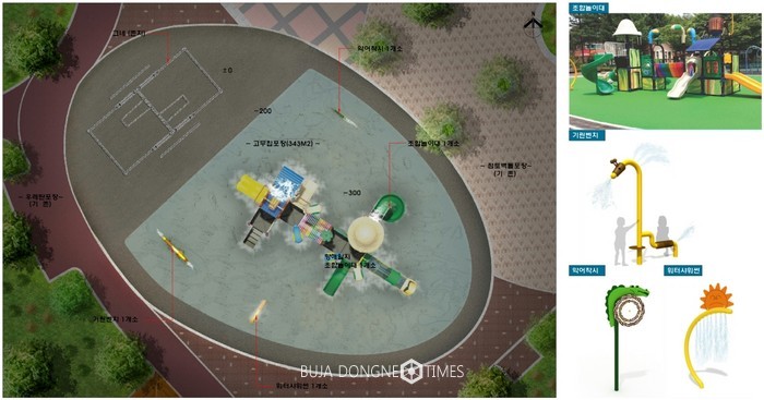 이를 위해 구는 총 3억 2천만원의 사업비를 들여 265㎡ 규모로 물놀이장을 조성할 계획이다. 물놀이를 즐길 수 있는 조합놀이대, 기린모양 벤치, 워터샤워 등 체험 위주의 놀이와 시설물을 설치하고 바닥은 미끄럼 방지를 위한 탄성포장으로 마감해 안전을 강화한다.