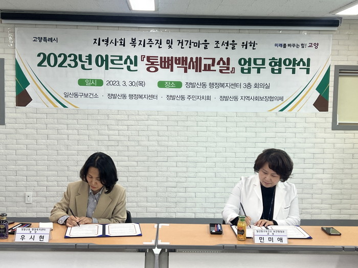 [부자동네타임즈 김인수기자] 고양특례시(시장 이동환) 일산동구보건소는 지난 30일 정발산동 행정복지센터와 어르신 골밀도 개선을 위한‘통뼈백세교실’ 업무협약을 체결했다.