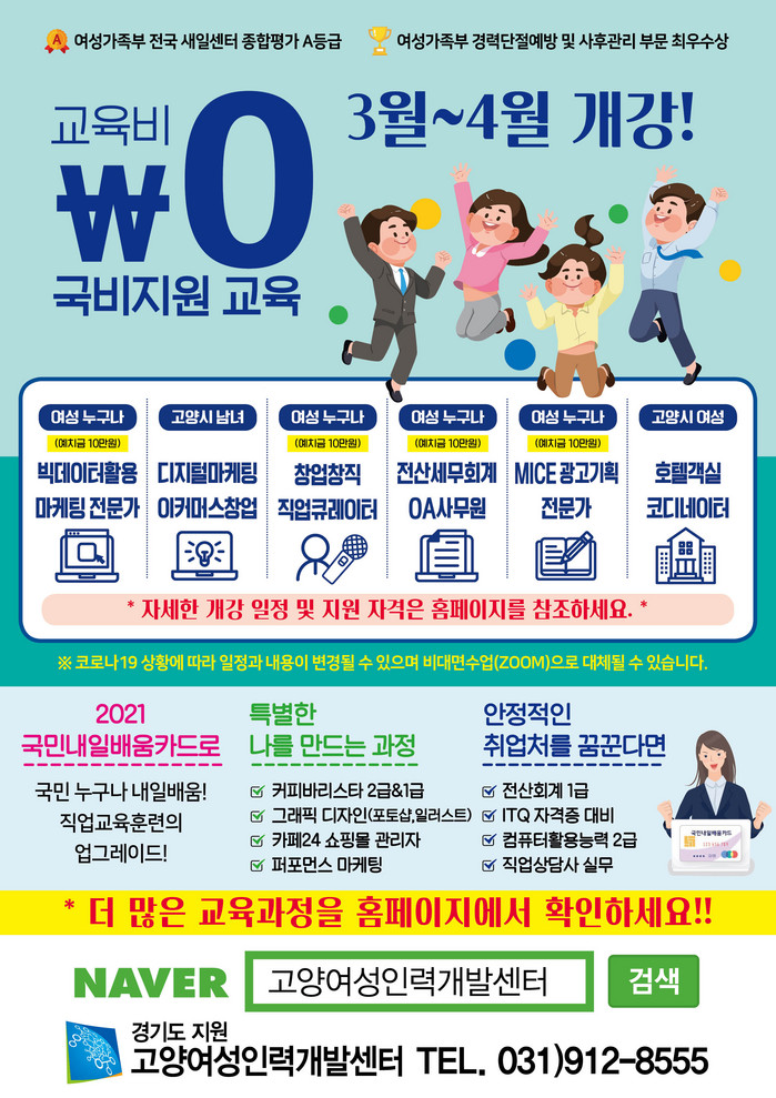 [부자동네타임즈 김인수기자] 고양시와 고양여성인력개발센터은 오는 30일부터 청년 및 여성의 취·창업 지원을 위한 2021년 국비지원 직업교육 훈련을 시작한다.