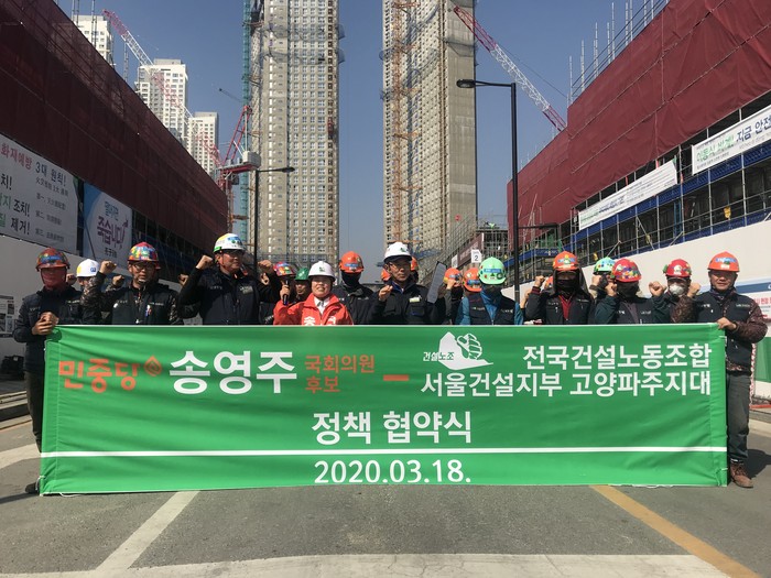 이날 협약식은 건설노조 소속 노동자 30여명과 민중당 송영주 후보가 참석했고, 삼송동 건설현장에서 이루어졌다.