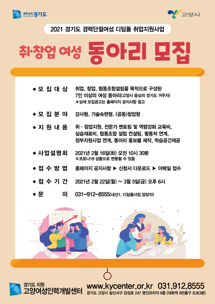 [부자동네타임즈 김인수기자] 고양시는 "고양여성인력개발센터(관장 유혜림)에서 경력단절 여성의 취·창업 활성화를 위한 2021년 ‘경력단절여성 디딤돌 취업지원 사업’에 참여할 여성 취·창업 동아리를 모집한다."고 밝혔다.