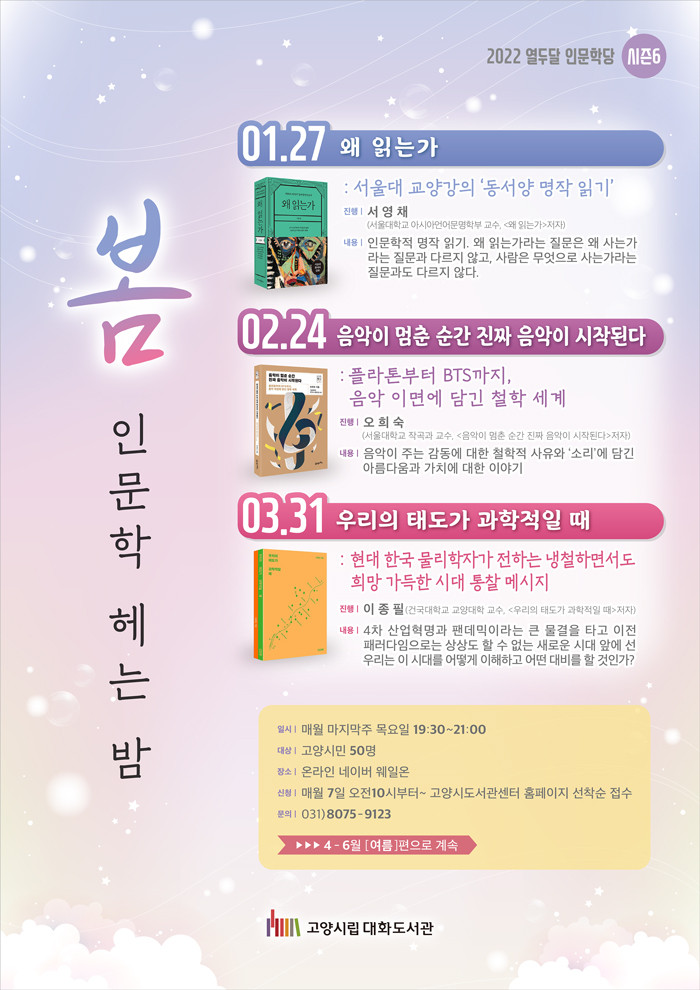 [부자동네타임즈 김인수기자] 고양시 대화도서관이 2022년 시즌 6을 맞이한 ‘열두달 인문학당’ 봄편을 운영한다. 1월 27일부터 시작하는 봄편 ‘인문학 헤는 밤’은 문학, 음악 등을 주제로 총 3회 진행될 예정이다.