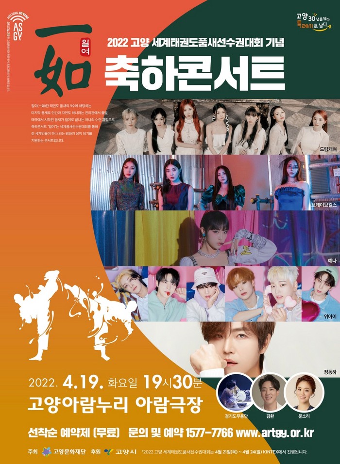 [부자동네타임즈 김인수기자] 고양문화재단은 ‘2022 고양 세계태권도품새선수권대회’의 유치를 기념하고, 성공 개최를 기원하기 위하여 오는 4월 19일 저녁 7시 30분 고양아람누리 아람극장에서 축하 콘서트 ‘일여(一如)’를 개최한다.