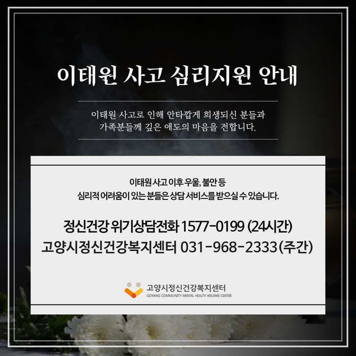 [부자동네타임즈 김인수기자] 고양시정신건강복지센터(센터장 이정석)가 지난 29일 발생한 이태원 사고와 관련해 트라우마로 고통받는 고양시민들을 대상으로 심리회복지원에 나섰다.