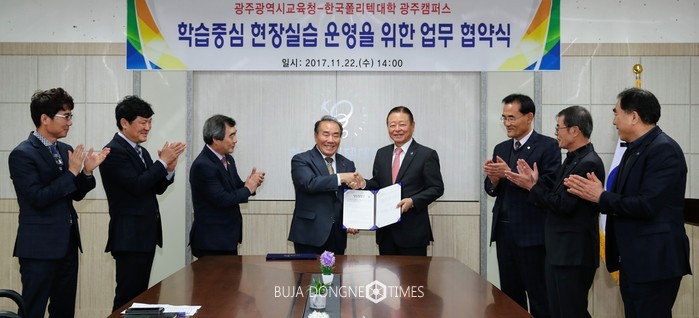 광주광역시 교육청(교육감 장휘국)과 한국폴리텍V대학(학장 안희석)은 11월 22일 특성화고 학습중심 현장실습 업무 협약을 체결했다.