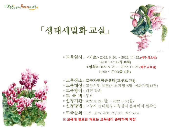 기초과정은 초보자도 가능하며, 심화과정은 세밀화교실에 참여했던 경험자를 대상으로 모집한다. 교육 신청은 8월 22일부터 9월 5일까지 고양시 생태환경교육센터 홈페이지에서 할 수 있다.