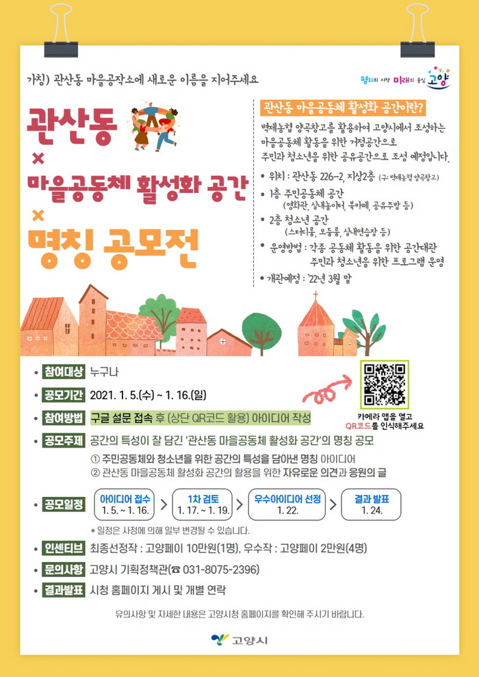 [부자동네타임즈 김인수기자] 고양시가 1월 5일부터 오는 16일까지 관산동 마을공동체 활성화 공간의 명칭을 공모한다. 관산동 마을공동체 활성화 공간은 지금까지 ‘관산동 마을공작소(가칭)’으로 불려온 곳이다.