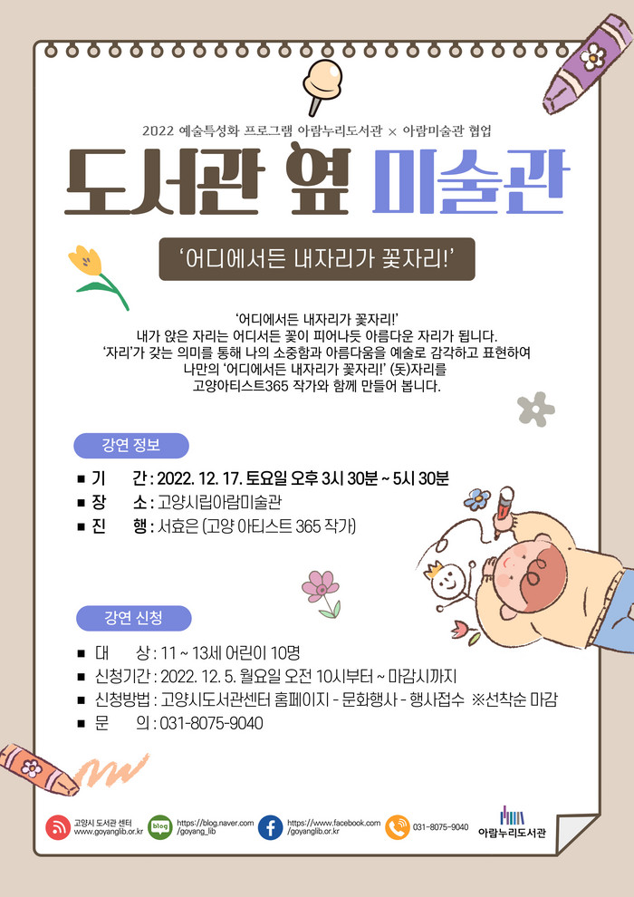 이번 프로그램은 고양아티스트 365 서효은 작가와 함께 ▲12/17 오후 1시 30분~3시에 초등 저학년 대상으로 ‘어디에서든 내자리가 꽃자리’ ▶12/17 오후 3시 30분~5시 30분에 초등 고학년을 대상으로 ‘나를 돌보는 손 ! 꽃다발!’을 진행한다.