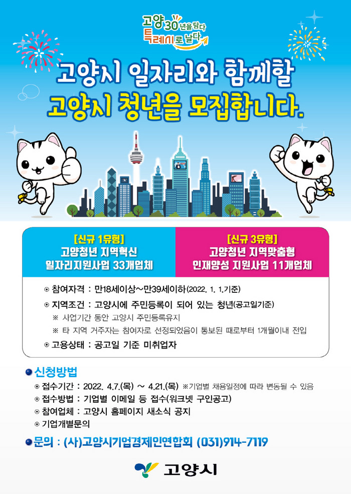 자세한 내용은 고양시 홈페이지 새소식과 고시공고에서 확인할 수 있으며, 기타 궁금한 사항은 고양시기업‧경제인연합회 또는 채용 기업에 문의하면 된다.