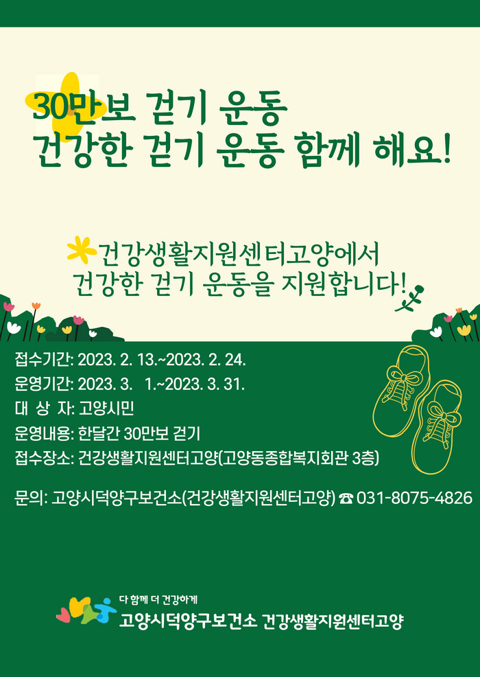 [부자동네타임즈 김인수기자] 고양특례시(시장 이동환) 건강생활지원센터에서 3월 1일부터 운동 습관 기르기 걷기 프로그램을 운영한다. 참여자는 3월 한 달 동안 30만보 걷기를 목표로 프로그램에 참여하게 되며 참여 전후 상담과 관리를 받는다.