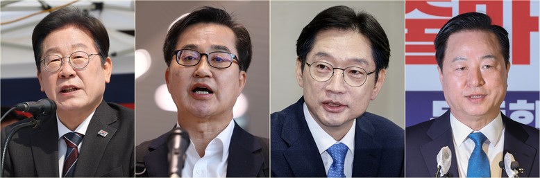더불어민주당 제21대 대통령선거 경선 출마자들. 왼쪽부터 이재명 전 민주당 대표, 김동연 경기지사, 김경수 전 경남지사, 김두관 전 의원. 2025.4.9