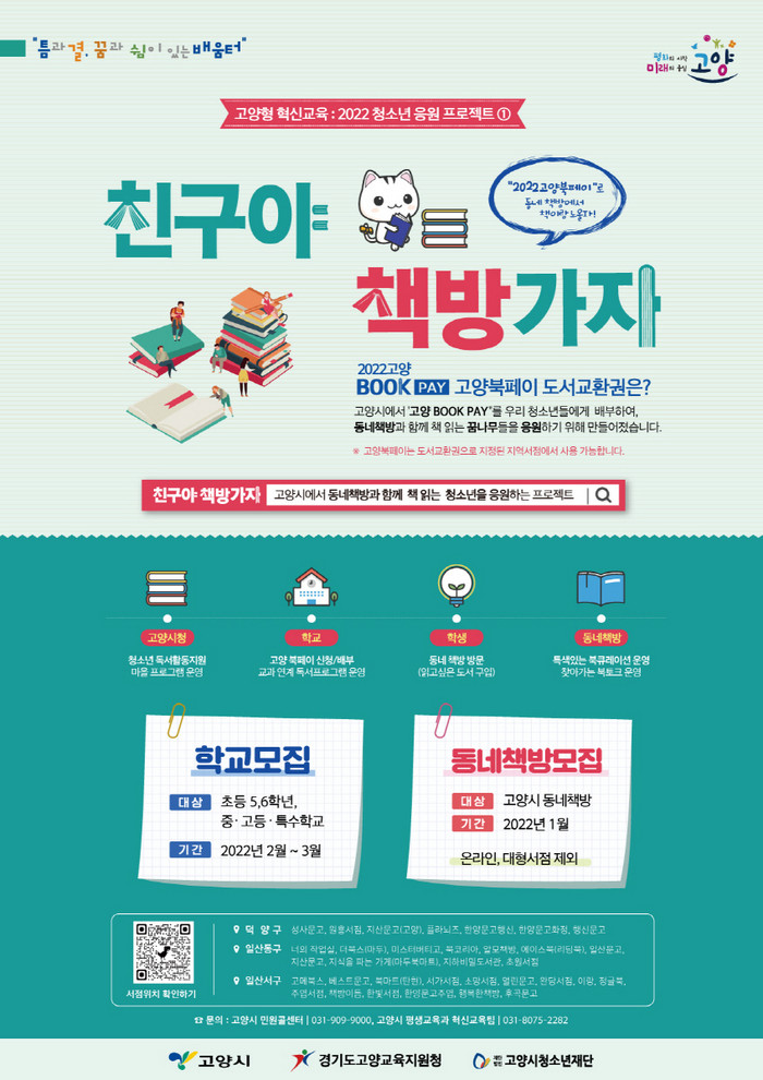 ‘친구야~ 책방가자!’는 초등학교 5, 6학년·중·고등학생, 학교밖 청소년을 대상으로 실시한다. 청소년에게 고양 Book페이 도서교환권을 배부하여 청소년이 동네 책방에서 책을 직접 고르고 독서에 흥미를 가질 수 있도록 응원한다는 취지다.