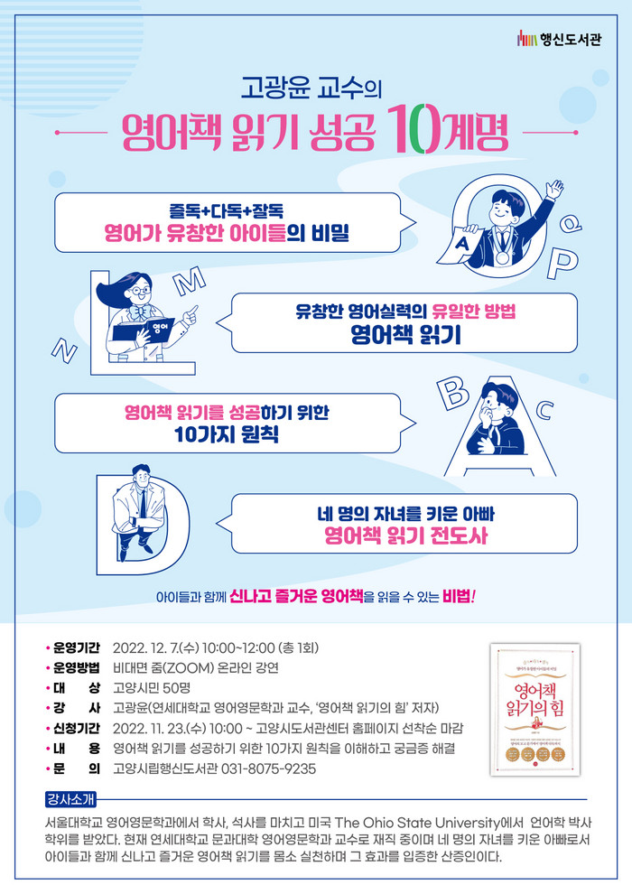 [부자동네타임즈 김인수기자] 고양특례시(시장 이동환) 행신도서관이 12월 7일(수) 독서문화프로그램 고광윤 교수의 영어책 읽기 성공 10계명을 온라인으로 운영한다.